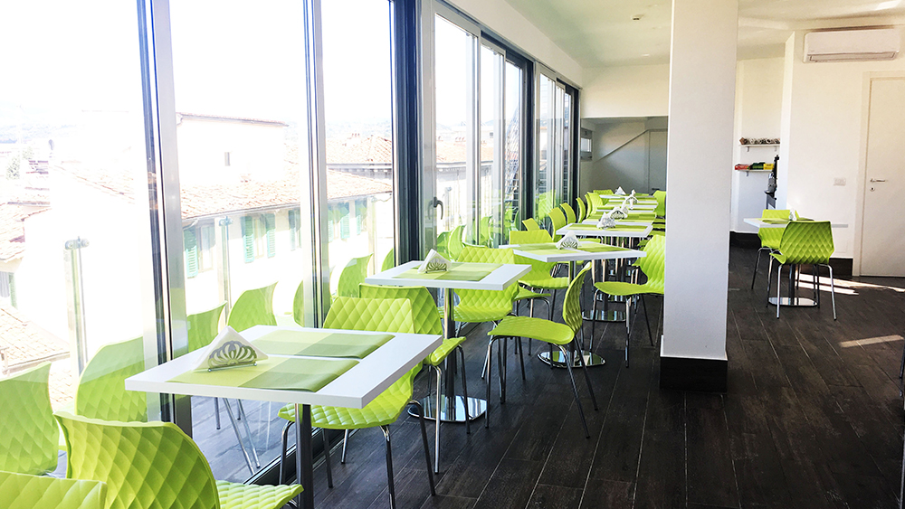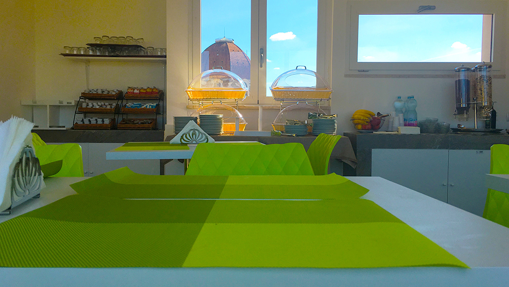 Starting the day wrapped in magical Florence is a wonderful feeling. Our guests will be able to enjoy breakfast in the very modern room set up on the 5th floor, all with windows. A rich buffet consisting of coffee (espresso, American, cappuccino), tea, hot chocolate, fruit juices, croissants, jams in various flavours, dry biscuits, rusks, cakes, cereals, fresh bread, plain and fruit yoghurt will delight guests. our guests.